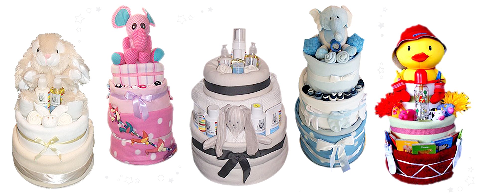 Our nappycakes only include baby-related products, such as nappies (cloth or disposable), blankets, toys, bath products and/or clothes & accessories.